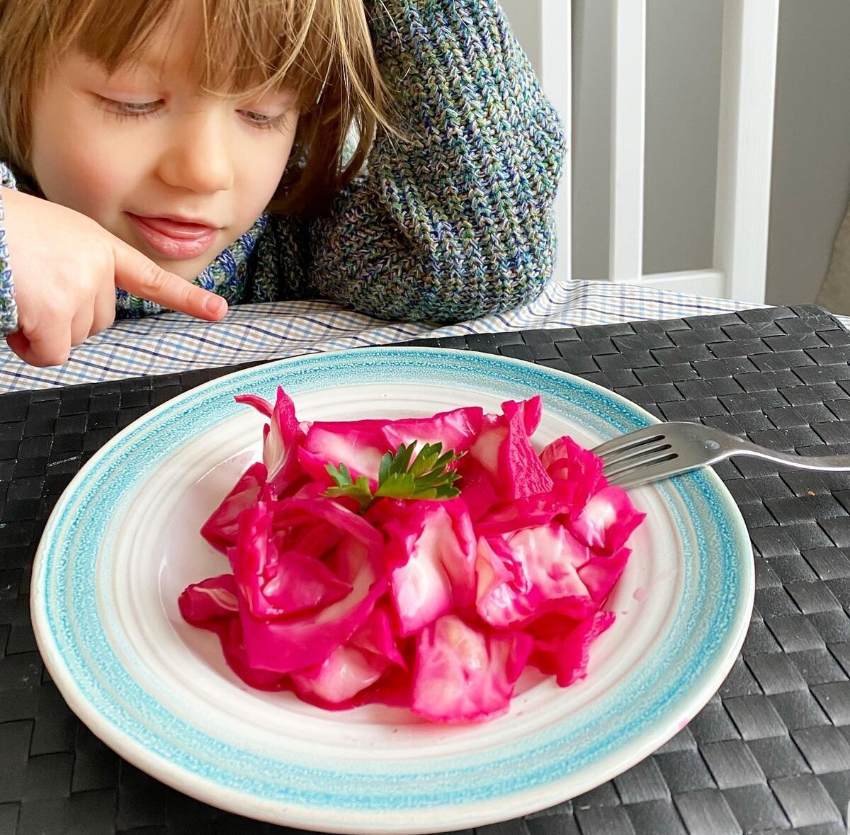 Вскипятите воду и добавьте туда нарезанный чеснок, лавровый лист, соль и уксус. Залейте горячим маринадом капусту и свёклу, дайте остыть при комнатной температуре, а затем уберите в холодильник на сутки.
