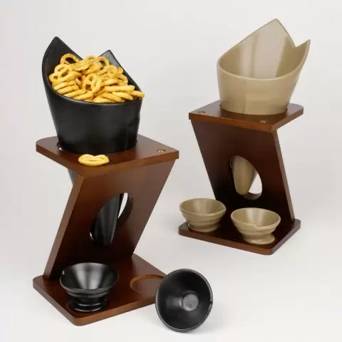 Новая модель блюдца выполнена в оригинальном дизайне, который напоминает классический бумажный кулек. Однако, в отличие от своего одноразового предшественника, этот фарфоровый шедевр отличается прочностью и долговечностью. Блюдо дополнено двумя соусниками, что делает его идеальным для настоящих гурманов, желающих насладиться картошкой фри с различными соусами.