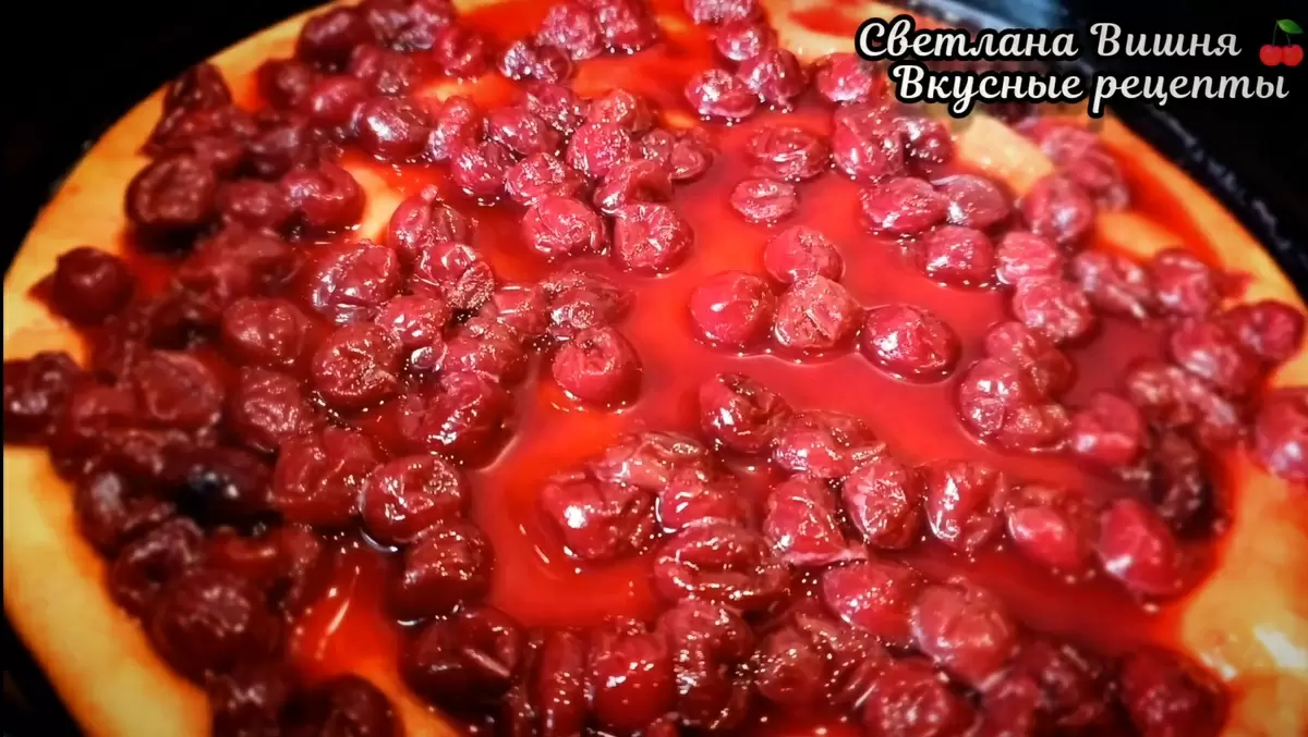 3. В это время начнем готовить вишневую заливку: в кастрюле смешиваем вишню, сахар и воду. Прогреваем до растворения сахара, затем добавляем агар-агар и варим еще 5 минут на медленном огне. Перемешиваем до получения желаемой консистенции.