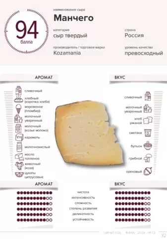 Аромат этого сыра необычайно интенсивный и сложный. В нем переплетаются сливочные и выпечные ноты с оттенками пломбира, орехов и карамели. Вкус Манчего также не оставит равнодушным: его гармония включает сливочные, ржаные и молочные тона, за которыми следуют яркие нюансы орехов, грибов и бульона. Этот твердый сыр станет великолепным дополнением к любой сырной тарелке и холодным закускам.