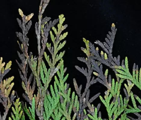 Помимо физических повреждений, на хвое могут проявляться также грибковые инфекции. Например, сажистый грибок появляется, если туя подвергается атаке вредителей, таких как тля или паутинный клещ. Грибок затрудняет дышать растению, закрывая поры и снижая его жизнеспособность. Если при его контакте с хвойными иголками обнаруживается черный налет, необходимо сразу же действовать: обрезать пораженные ветки и обработать растение подходящими инсектицидами. В качестве борьбы с грибковыми инфекциями подойдут препараты, такие как "Строби" или "Хорус".
