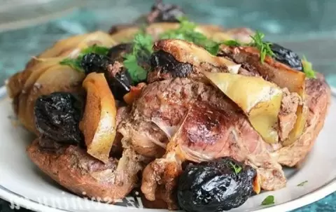 - Сочная текстура: Запекаясь, яблоки и чернослив выделяют сок, который пропитывает мясо, обеспечивая его нежность и сочность.