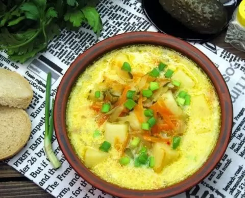Картофель очистить и нарезать кубиками, затем опустить в кипящий бульон и варить 15-20 минут до мягкости. Параллельно лук и морковь следует нарезать и поджарить: сначала лук до прозрачности, затем добавить натертую морковь и жарить до золотистого цвета.