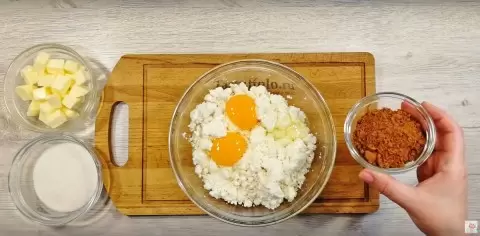 Первым делом, в глубокой миске объедините 500 г жирного творога, два яйца и 2 ст. л. порошка какао. Применение хорошего творога – залог успеха нашего сырка. Далее добавьте 120 г сахара, 100 г размягченного сливочного масла и щепотку соли. Чтобы достигнуть идеальной консистенции, перемешивайте все ингредиенты тщательно.